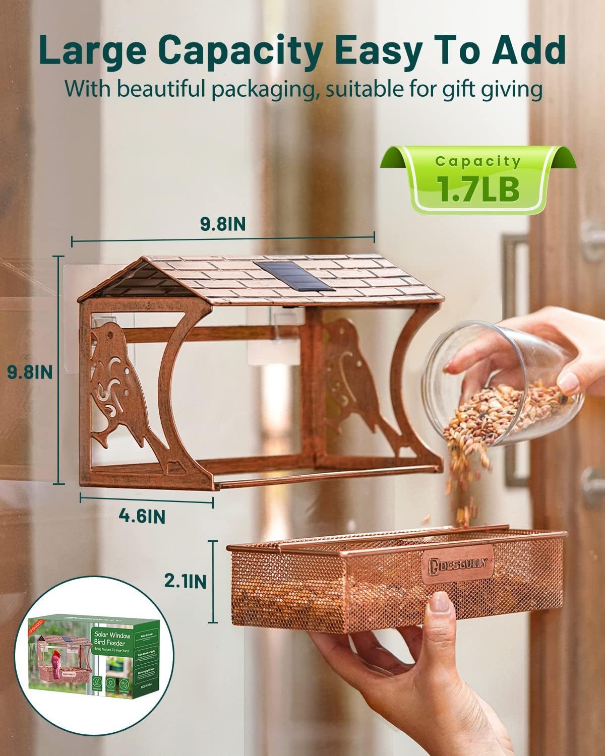 Consumer-Pleasant and Low Upkeep: Holds as much as 1.7 kilos of seeds with an easy-to-remove tray for fast refills and cleansing. The mesh tray retains seeds dry, and all the feeder will be eliminated for glass cleansing