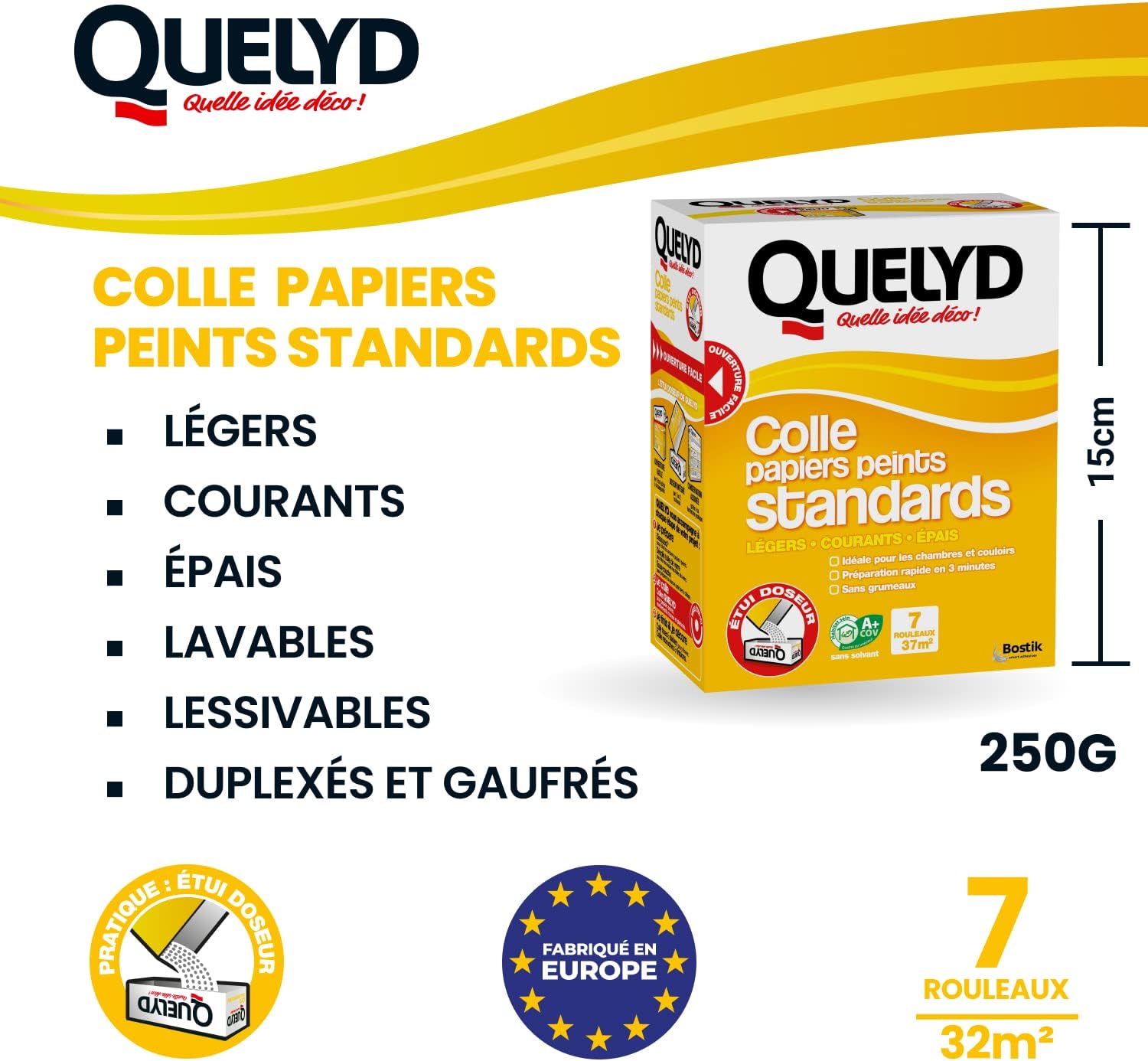 Quelyd Normal Wallpaper Glue glues all wallpapers: present, mild, thick, washable, leachable, embossed and duplexed wallpapers. It’s very best for rooms and hallways. Its starch system has been specifically developed to facilitate the preparation of the glue due to its measuring cap and optimize the set up of the wallpaper. Its solvent-free system ensures a lump-free glue, fast and easy to use. Consumption: 7 rolls, or 37 m². Storage: 24 months in its unique unopened packaging in a dry place protected against moisture.