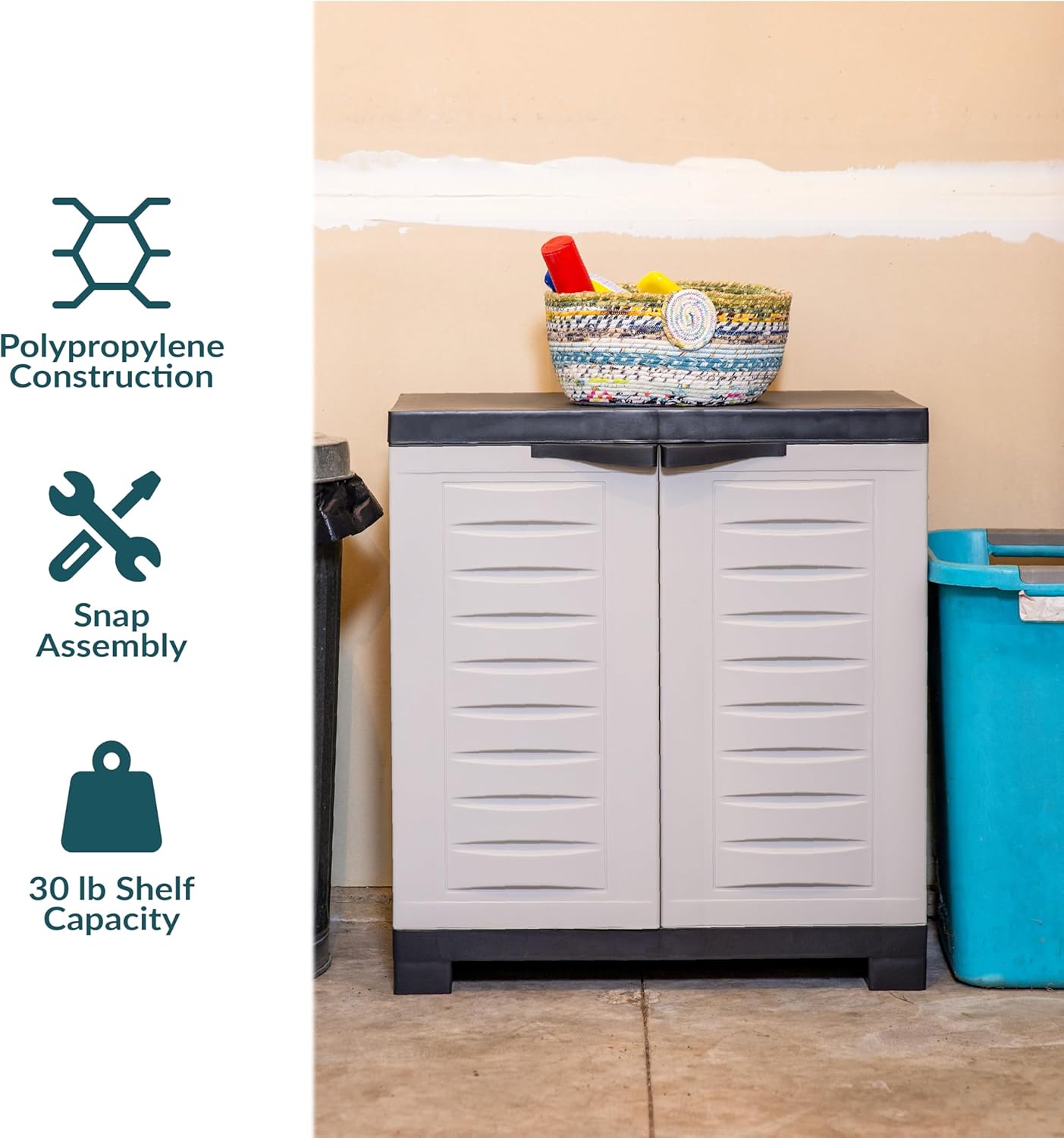 CONVENIENT STORAGE: The heavy-duty plastic storage cupboard with doorways is a handy storage choice for a closet, workplace, or storage. The cupboard measures 23.25″ W x 13.75″ D x 25.5″ H general and weighs 9.8 lbs. The adjustable shelf measures 21″ W x 11.75″ D x 1″ thick and might be adjusted in 4″ increments. The shelf holds 30 lbs, and the highest of the cupboard holds 30 lbs.