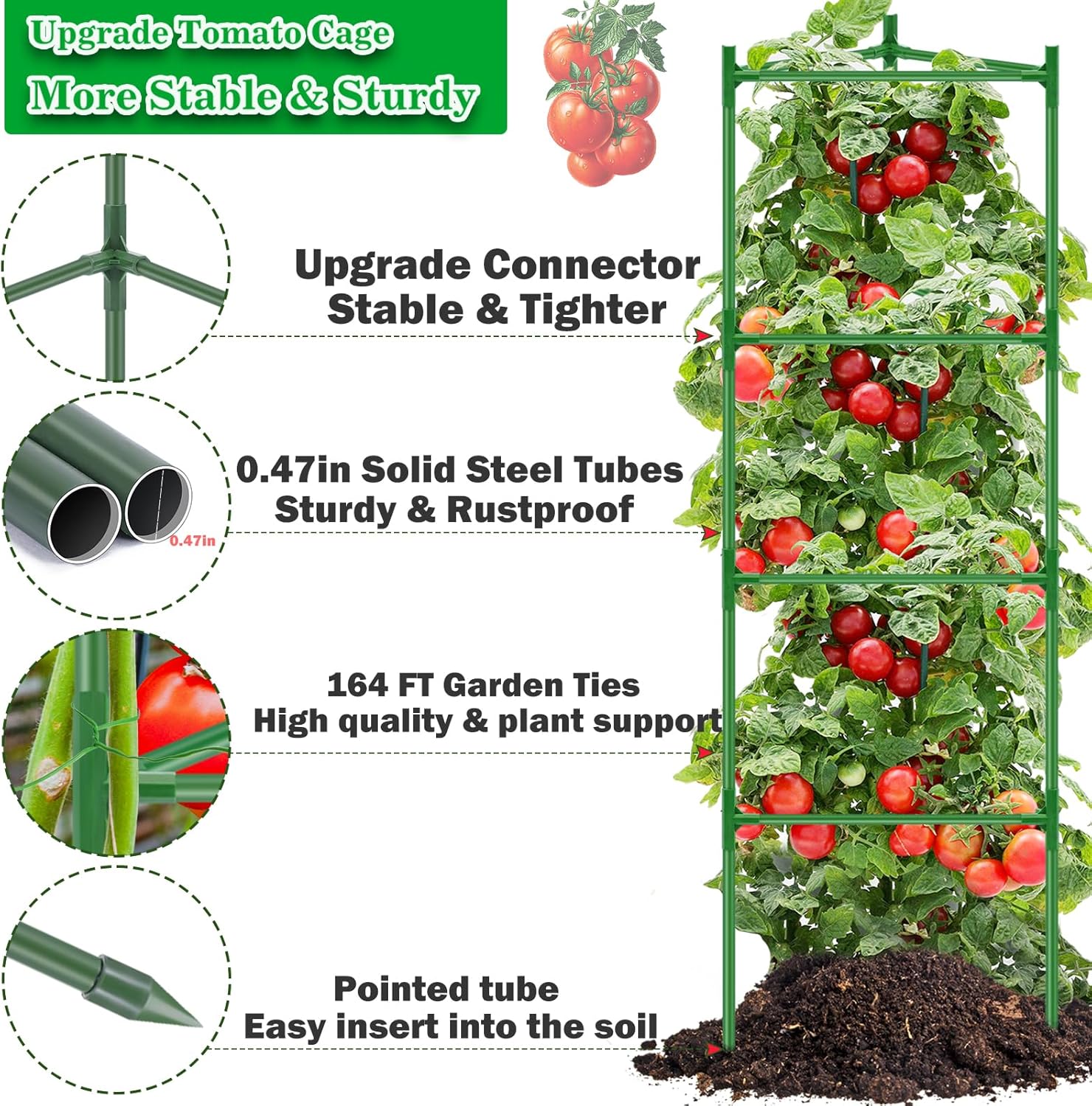 3 Packs Heavy Responsibility Tomato Cages 68in :3 Packs of tomato cage embody 9 Pcs Pointed tube, 27 Lengthy tube,36 Pcs quick tube, 36 Pcs 4-way Connectors,and 164FT backyard plant ties.Tomato Cages for backyard assemble can as much as 68in excessive and 12in lengthy backyard cages, Our tall tomato plant Cage can present ample house and Steady atmosphere for plant to development, DIY the peak of the Tomato Cages because the vegetation develop to supply higher help to your Vegetable Climbing Vegetation.