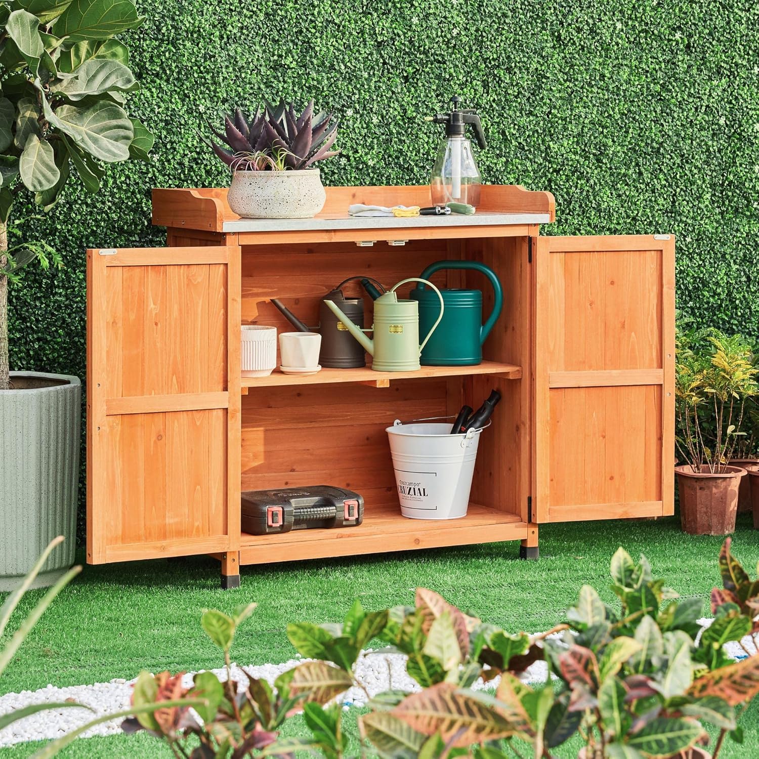 Backyard Potting Bench Desk, Out of doors Backyard Patio Wood Storage Cupboard with Metallic Tabletop