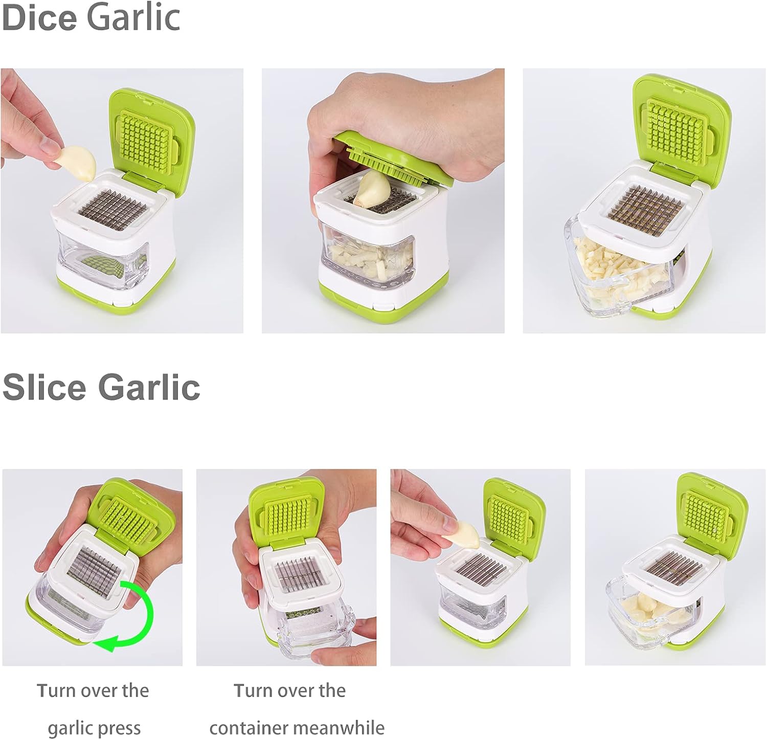 【Revolutionary Design of the Construction】 Its ergonomic design makes it simple to press the cloves with a palm. The garlic slices or dices are collected into the container. No want to vary the blade so long as the up and down flip can obtain the conversion of dicing and slicing.